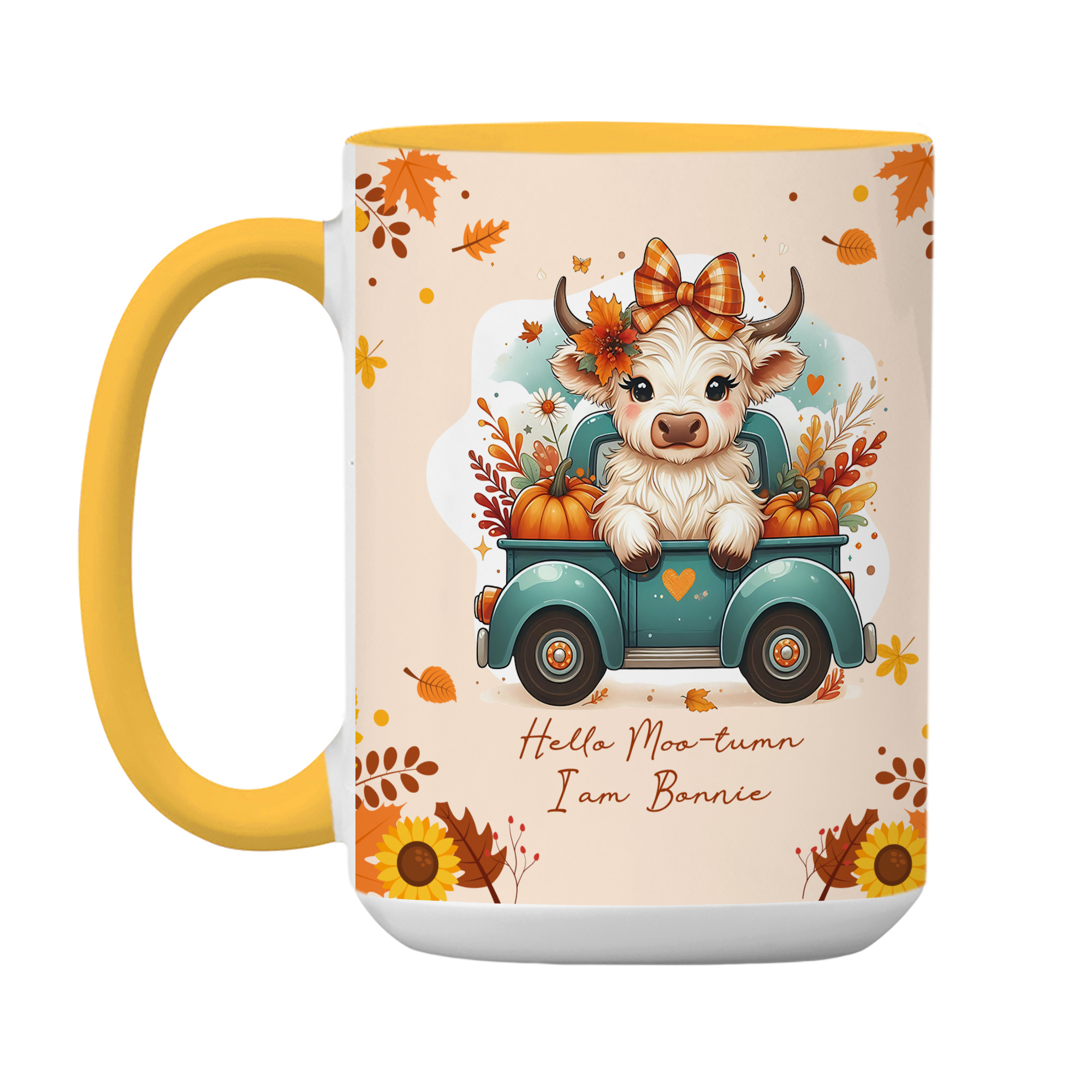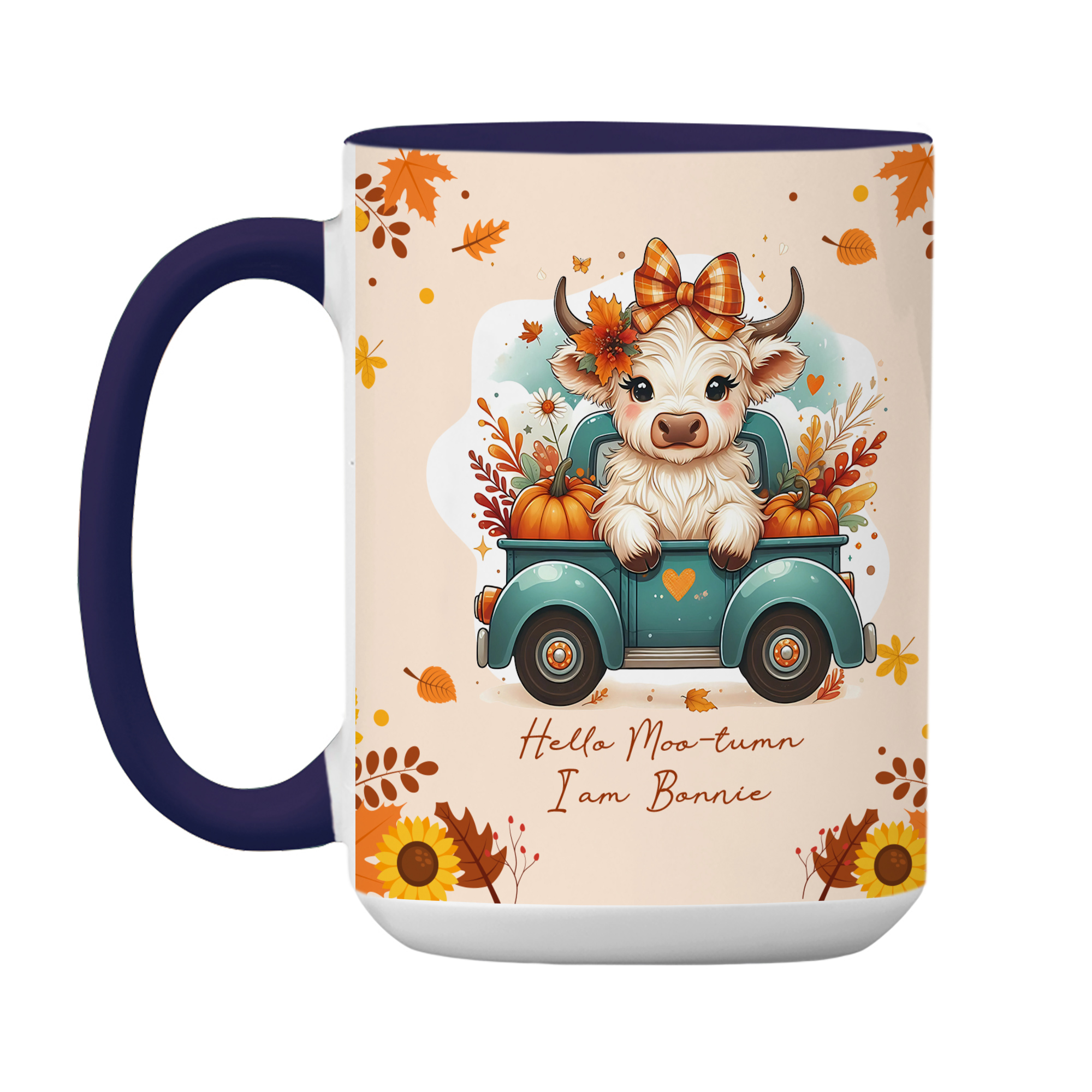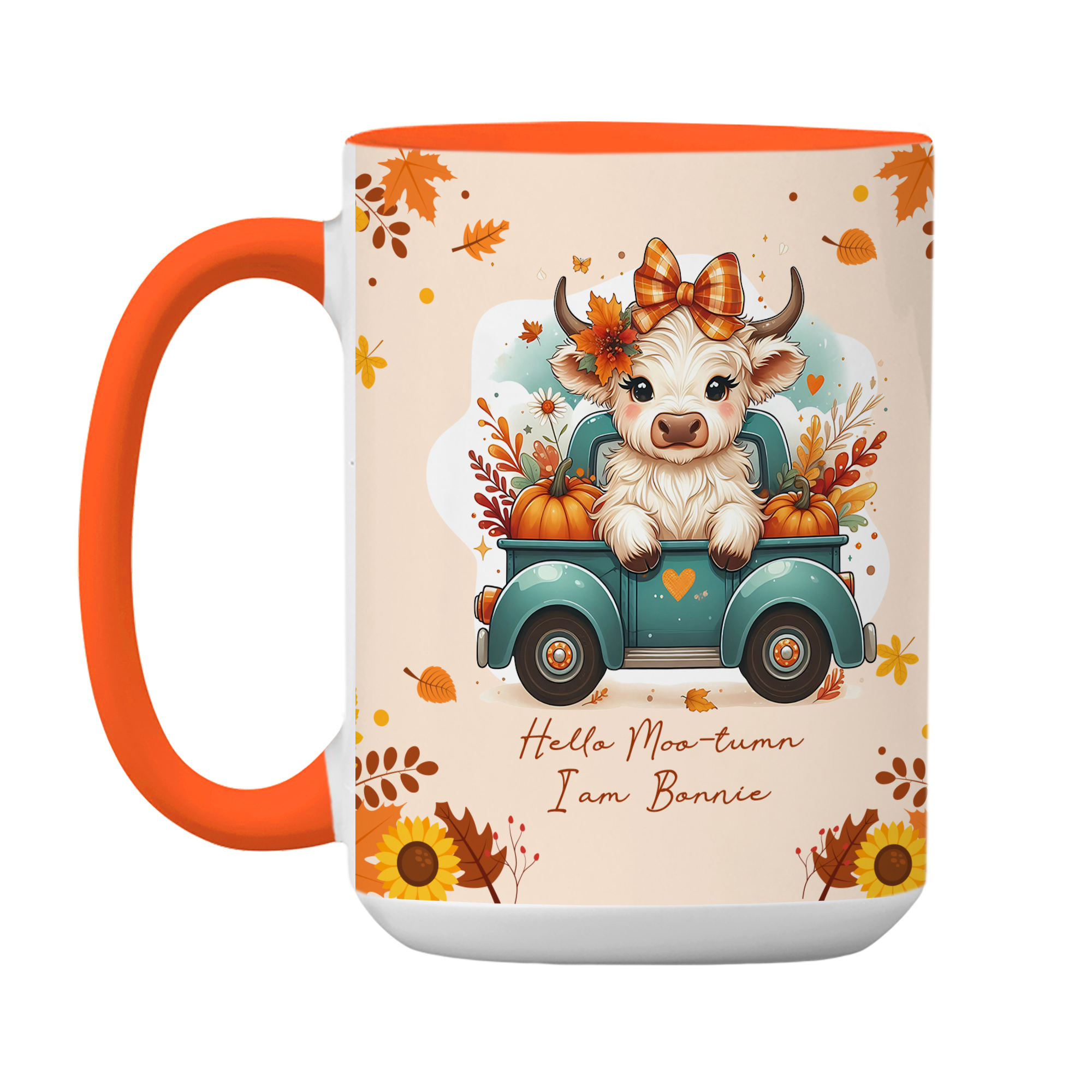 The cute Highland Cattle Autumn Pumpkin Mug can be customized with your name and your favorite Highland Cattle pattern. There are multiple mug colors to choose from. It is a practical gift for Highland Cattle lovers, a Thanksgiving gift, or an autumn gift.